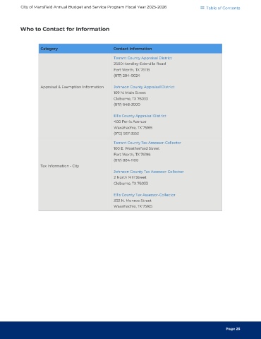 City of Mansfield Annual Budget and Service Program Fiscal Year 2025-2026 Table of Contents