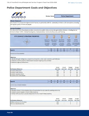 City of Mansfield Annual Budget and Service Program Fiscal Year 2025-2026 Table of Contents Police Department Goals and Objectives Page 252