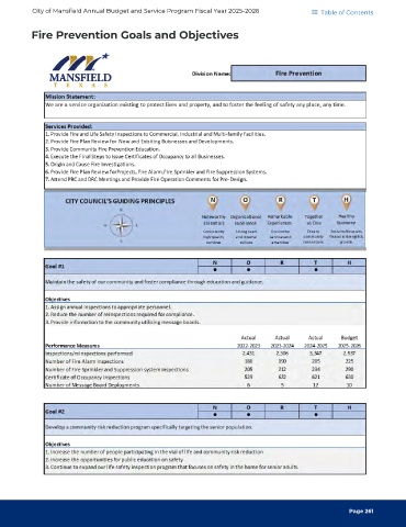 City of Mansfield Annual Budget and Service Program Fiscal Year 2025-2026 Table of Contents Fire Prevention Goals and Objectives Page 261