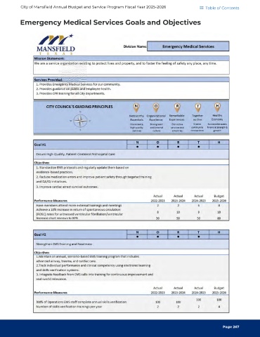 City of Mansfield Annual Budget and Service Program Fiscal Year 2025-2026 Table of Contents Emergency Medical Services Goals and Objectives Page 267