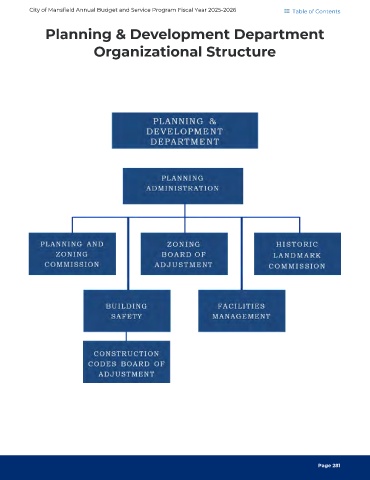 City of Mansfield Annual Budget and Service Program Fiscal Year 2025-2026 Table of Contents Planning & Development Department Organizational Structure Page 281