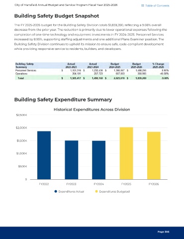 The FY 2025-2026 budget for the Building Safety Division totals $1,839,280, reflecting a 9.08% overall
