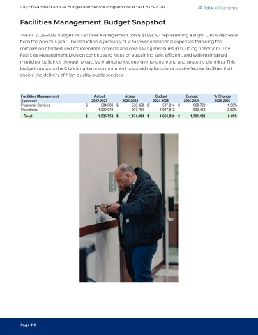 The FY 2025-2026 budget for Facilities Management totals $1,591,181, representing a slight 0.85% decrease