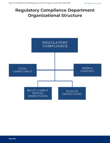 City of Mansfield Annual Budget and Service Program Fiscal Year 2025-2026 Table of Contents Regulatory Compliance Department Organizational Structure Page 322