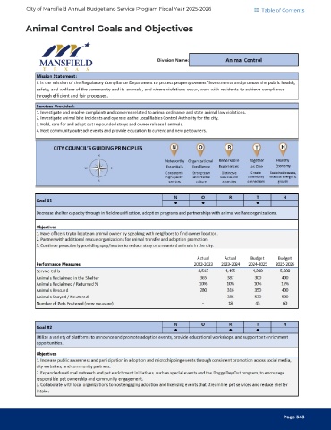 City of Mansfield Annual Budget and Service Program Fiscal Year 2025-2026 Table of Contents Animal Control Goals and Objectives Page 343