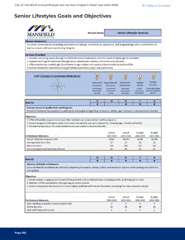 City of Mansfield Annual Budget and Service Program Fiscal Year 2025-2026 Table of Contents Senior Lifestyles Goals and Objectives Page 352