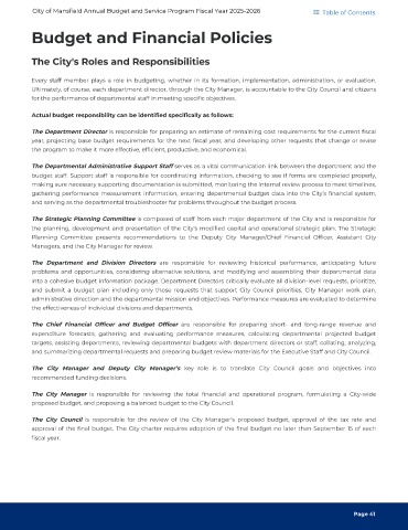 City of Mansfield Annual Budget and Service Program Fiscal Year 2025-2026 Table of Contents