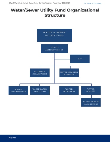 City of Mansfield Annual Budget and Service Program Fiscal Year 2025-2026 Table of Contents Water/Sewer Utility Fund Organizational Structure Page 422