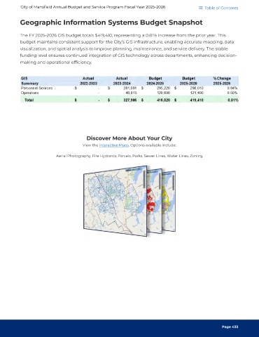 The FY 2025-2026 GIS budget totals $419,410, representing a 0.81% increase from the prior year. This
