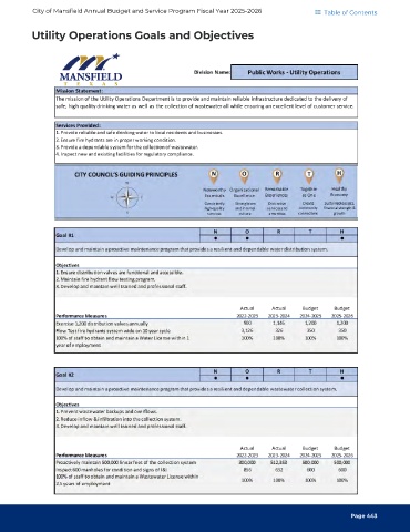City of Mansfield Annual Budget and Service Program Fiscal Year 2025-2026 Table of Contents Utility Operations Goals and Objectives Page 443