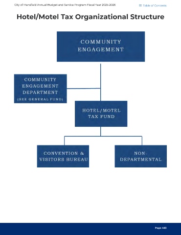 City of Mansfield Annual Budget and Service Program Fiscal Year 2025-2026 Table of Contents Hotel/Motel Tax Organizational Structure Page 463