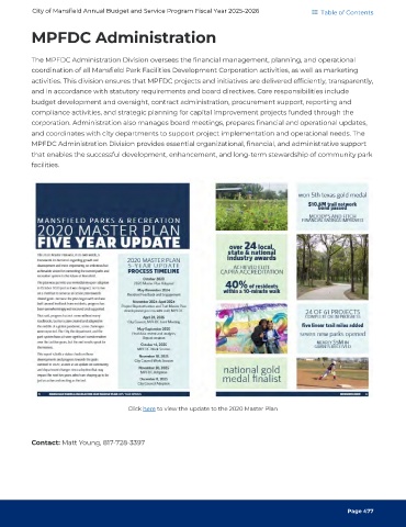 coordination of all Mansfield Park Facilities Development Corporation activities, as well as marketing