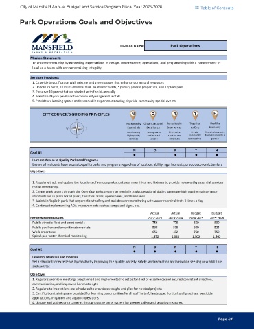 City of Mansfield Annual Budget and Service Program Fiscal Year 2025-2026 Table of Contents Park Operations Goals and Objectives Page 491
