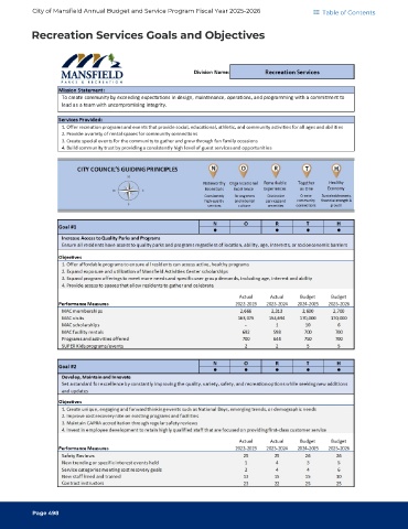 City of Mansfield Annual Budget and Service Program Fiscal Year 2025-2026 Table of Contents Recreation Services Goals and Objectives Page 498