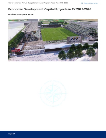 City of Mansfield Annual Budget and Service Program Fiscal Year 2025-2026 Table of Contents Economic Development Capital Projects in FY 2025-2026 Multi-Purpose Sports Venue Page 530