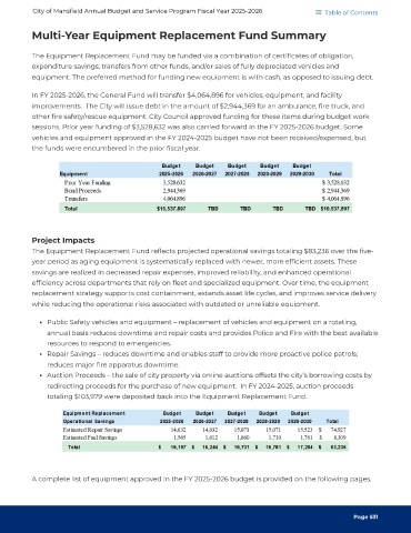 Multi-Year Equipment Replacement Fund Summary