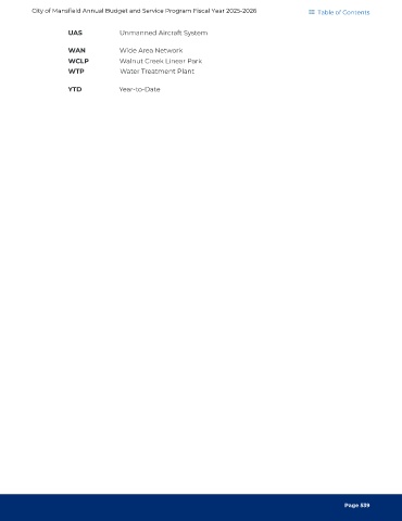 City of Mansfield Annual Budget and Service Program Fiscal Year 2025-2026 Table of Contents UAS Unmanned Aircraft System WAN Wide Area Network WCLP Walnut Creek Linear Park WTP Water Treatment Plant Year-to-Date YTD Page 539