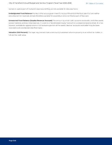 Unreserved Fund Balance (Surplus Revenue Account): The amount by which cash, accounts receivable, and other assets