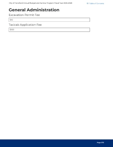 City of Mansfield Annual Budget and Service Program Fiscal Year 2025-2026 Table of Contents General Administration Excavation Permit Fee $10 Taxicab Application Fee $100 Page 573