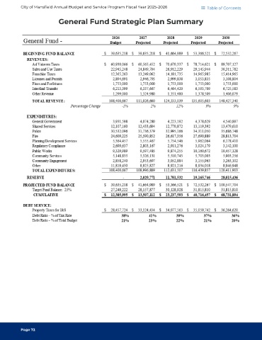 City of Mansfield Annual Budget and Service Program Fiscal Year 2025-2026 Table of Contents General Fund Strategic Plan Summary Page 72