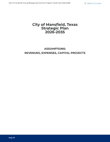 City of Mansfield Annual Budget and Service Program Fiscal Year 2025-2026 Table of Contents City of Mansfield, Texas Strategic Plan 2026-2035 ASSUMPTIONS: REVENUES, EXPENSES, CAPITAL PROJECTS Page 76