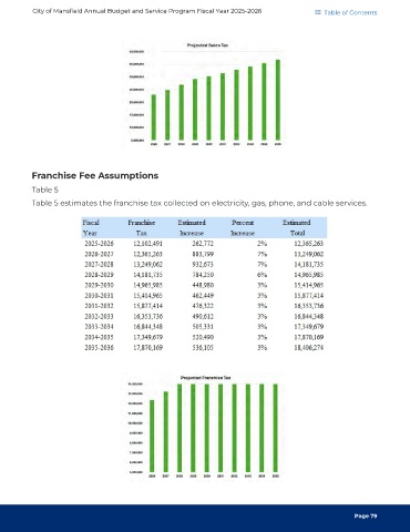 City of Mansfield Annual Budget and Service Program Fiscal Year 2025-2026 Table of Contents Franchise Fee Assumptions Table 5 Table 5 estimates the franchise tax collected on electricity, gas, phone, and cable services. Page 79