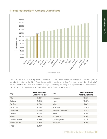 contribution rate for the City of Southlake and its benchmark cities. This chart shows that Southlake’s