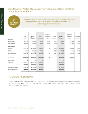 on outstanding debt. For FY 2026, the SPDC Debt Service Fund will cover total expenditures of