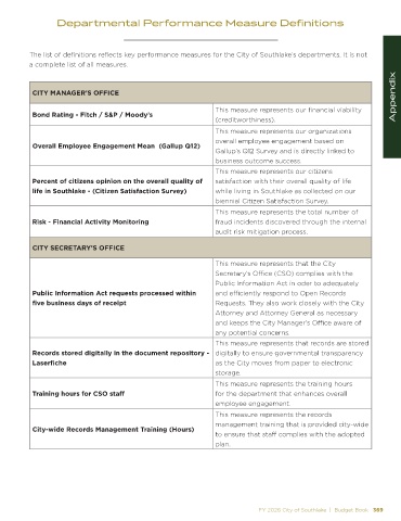 The list of definitions reflects key performance measures for the City of Southlake’s departments. It is not