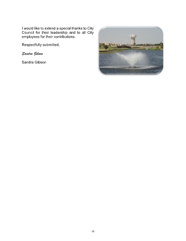 I would like to extend a special thanks to City Council for their leadership and to all City employees for their contributions. Respectfully submitted, Sandra Gibson Sandra Gibson 16