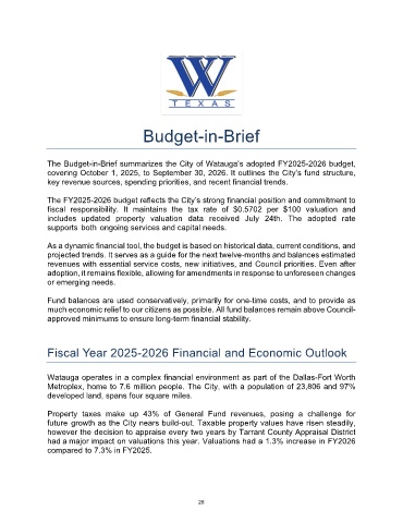 The Budget-in-Brief summarizes the City of Watauga’s adopted FY2025-2026 budget,