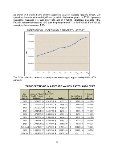 As shown in the table below and the Assessed Value of Taxable Property Graph, City