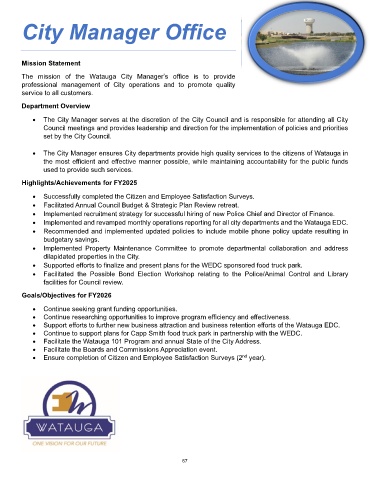 • The City Manager ensures City departments provide high quality services to the citizens of Watauga in